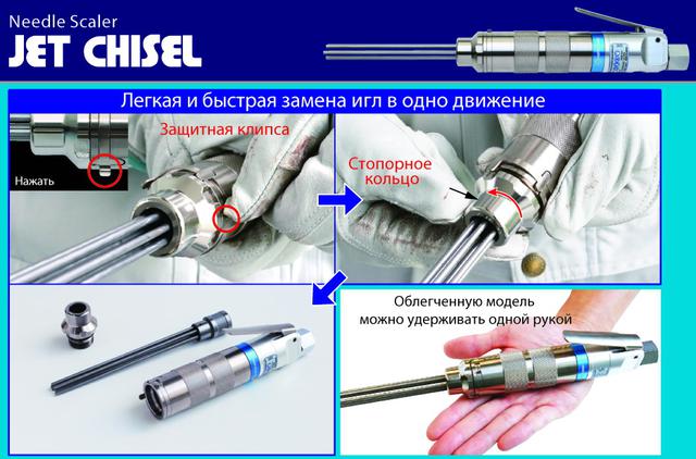 Голчасті (пучкові) зачисні молотки Jet Chisel компанії Nitto Kohki відносяться до ударних промисловим інструментів Needle Scaler і володіють різними технічними характеристами, що дозволяє вибрати зручний, високоякісний і відповідний інструмент для виконання різних завдань в промисловості, судноремонтних робіт і для постачальників шипчандлерских послуг і послуг постачання берегових підприємств. Голчасті зачисні молотки Jet Chisel відрізняються легким вагою, компактністю, функціональністю, потужністю, частотою ударів в хвилину, розмірами та іншими характеристиками. Інструменти Nitto Kohki використовуються для очищення зварювальних швів від флюсу і окалини, а також при спільних операціях зачистки і очищення поверхонь від іржі, покриттів, налипань, забруднень, зняття старого покриття, фарби зі сталевих металевих конструкцій. Обробка металу, зварювальні шви у більшості випадків вимагають доопрацювання, оскільки акуратність і точність при зварюванні не завжди досяжні. Молоток являє собою ударний пристрій для зачистки міцних зносостійких поверхонь від фарби, іржі, окалини з металу, для технічного обслуговування автомобілів та виробничого обладнання. Комплекти голок різної форми, з різних матеріалів, роблять їх придатними для більшості операцій.