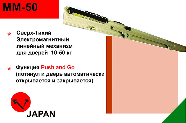 Асистевий, Унікальний БЕЗШУМНИЙ, екологічно чистий Японський механізм на базі електромагнітного лінійного приводу, що створює ковзне електромагнітне поле, приводячи в рух стулки дверей. Абсолютно безшумний у роботі та не створює пил, продукти зносу в приміщенні. Механізм не має приводного ременя, щіткового двигуна, що створює продукти зносу. Контролер керує режимами роботи та логікою дверей.